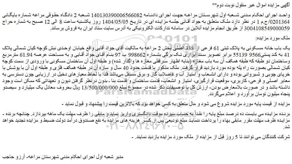 واحد اجرای احکام مدنی شعبه اول شهرستان مراغه جهت اجرای دادنامه 140130390006566082 شعبه 2 دادگاه حقوقی مراغه شماره بایگانی 0201364/ج.م 1 در نظر دارد ملک متعلق به جواد آقائی جلسه مزایده ای در تاریخ 1404/05/05 روز یکشنبه ساعت 8 الی 12 صبح به شماره حراج 3004108549000059 از طریق انجام مزایده آنلاین در سامانه تدارکات الکترونیکی به آدرس سایت ستاد ایران به فروش برساند.