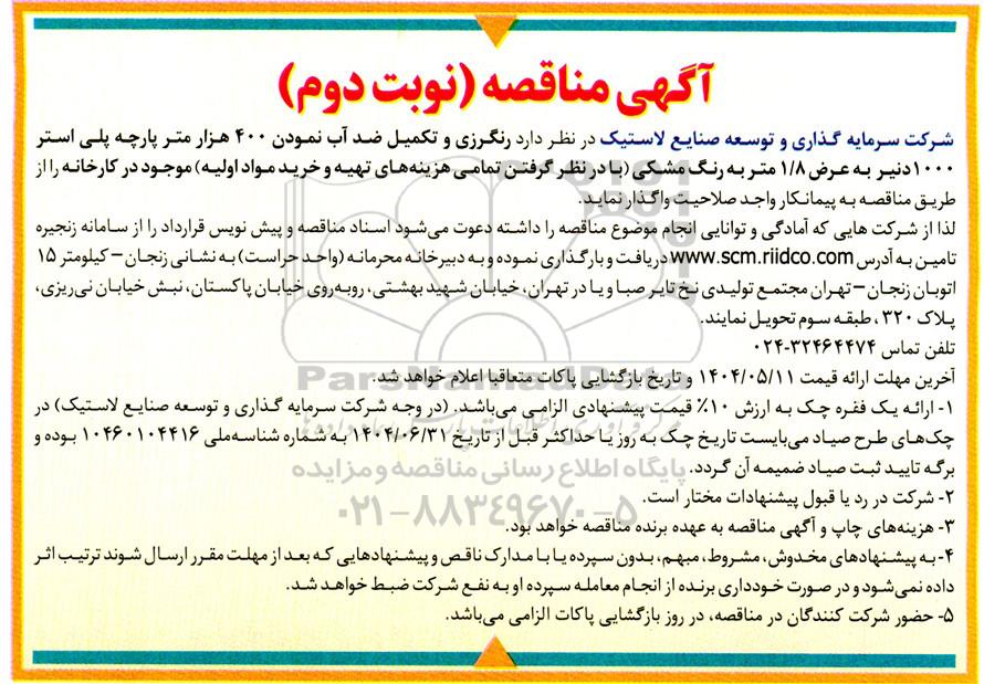 مناقصه رنگرزی و تکمیل ضد آب نمودن 400 هزار متر پارچه پلی استر 1000 دنیر...- نوبت دوم , مناقصه رنگرزی و تکمیل ضد آب نمودن 400 هزار متر پارچه پلی استر 1000 دنیر...- نوبت دوم