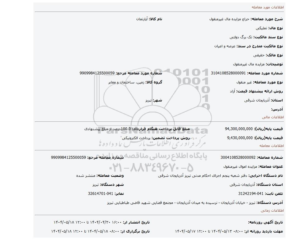 | شرح مورد معامله: حراج مزایده مال غیرمنقول | نام کالا: آپارتمان | |