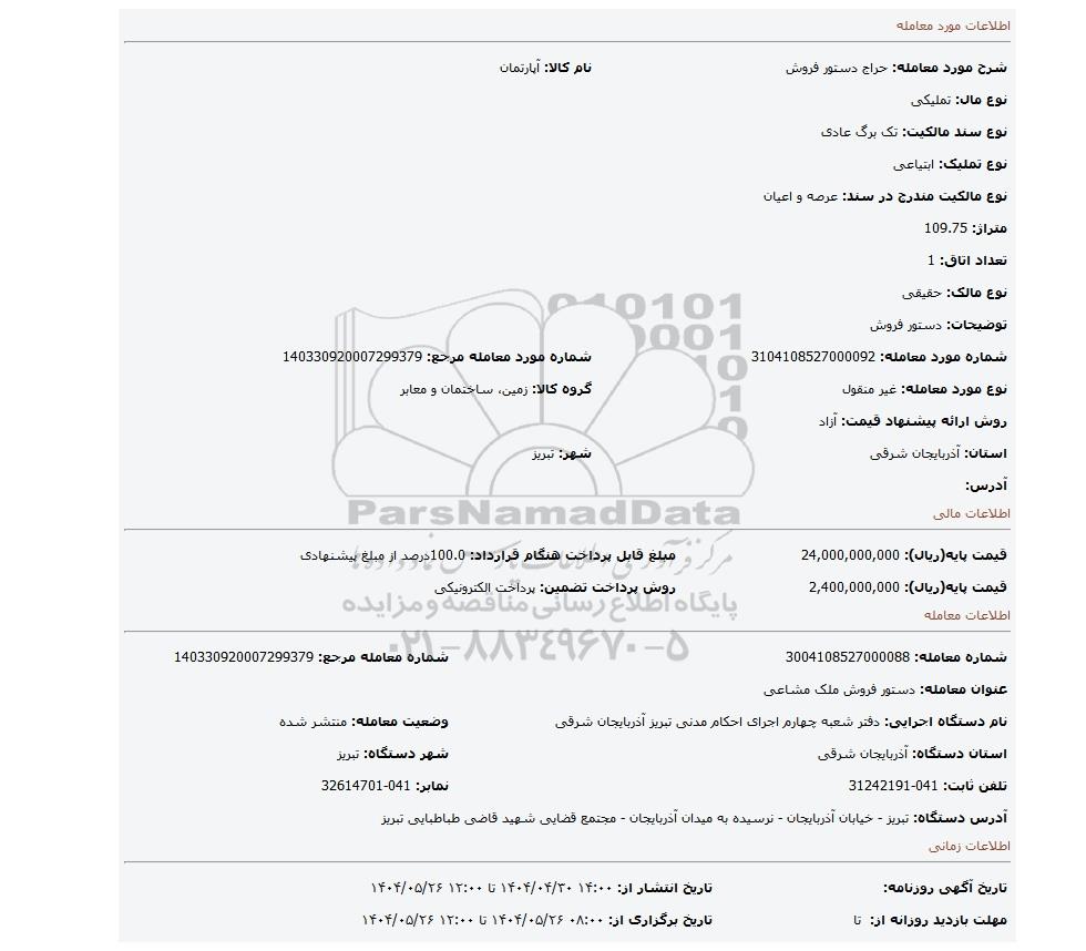 9 مزایده دستور فروش ملک مشاعی 9810687 1404/08/15 new not special not payed آذربایجان شرقی