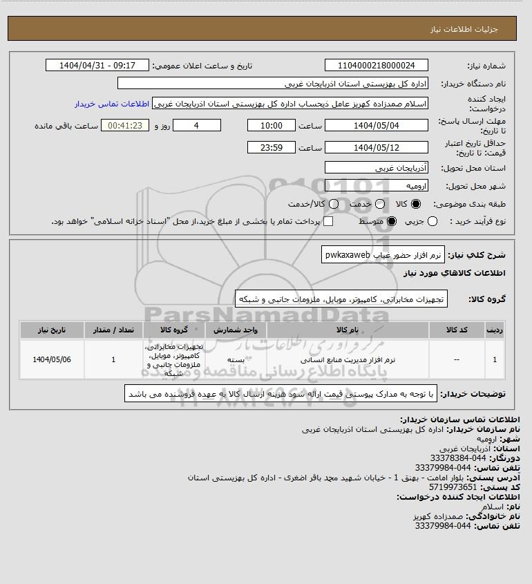 | 1 | -- | نرم افزار مدیریت منابع انسانی | بسته | تجهیزات مخابراتی، کامپیوتر، موبایل، ملزومات جانبی و شبکه | 1 | 1404/05/06 |