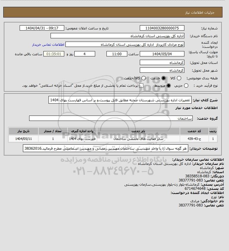 شرح کلی نیاز: تعمیرات اداره بهزیستی شهرستان صحنه مطابق فایل پیوست.و بر اساس فهارست بهای 1404