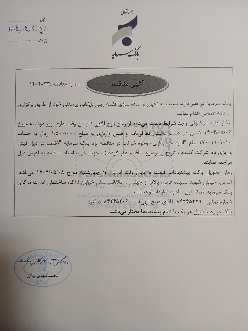 بانک سرمایه در نظر دارد، نسبت به تجهیز و آماده سازی قفسه ریلی بایگانی پرسنلی خود از طریق برگزاری مناقصه عمومی اقدام نماید.