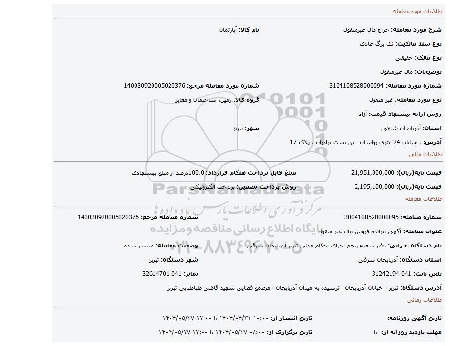 | شرح مورد معامله: حراج مال غیرمنقول | نام کالا: آپارتمان | |