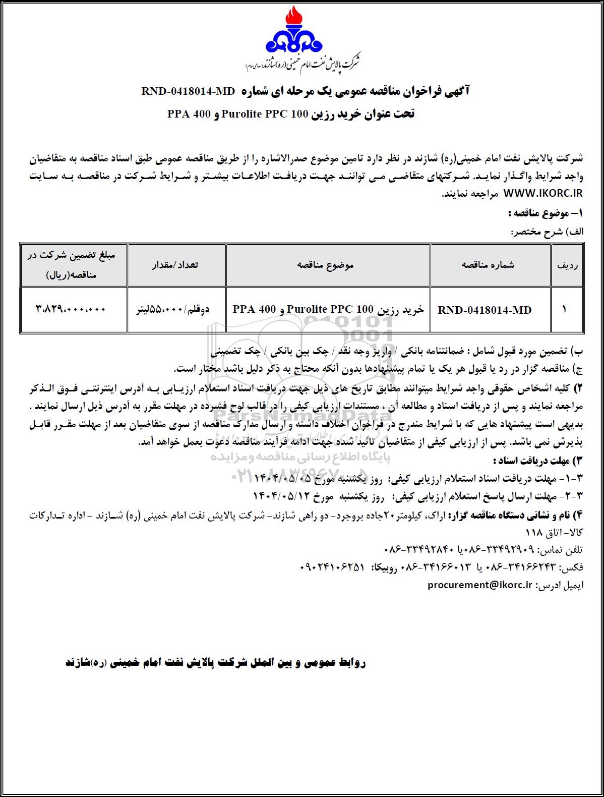 مناقصه عمومی خرید رزین Purolite PPC 100 و PPA 400 از کلیه افراد متخصص و شرکت‌ها واجد شرایط دعوت به عمل می‌آید در مناقصه با کد خبرگزاری پارس نماد: 9307333 شرکت نمایند. این مناقصه در تاریخ 1404/04/31 شروع و مهلت آن تا تاریخ 1404/05/05 میباشد.