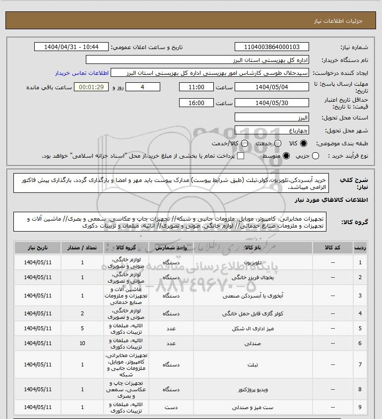 شرح کلی نیاز: خرید آبسردکن،تلویزیون،کولر،تبلت (طبق شرایط پیوست) مدارک پیوست باید مهر و امضا و بارگذاری گردد. بارگذاری پیش فاکتور الزامی میباشد.