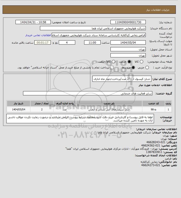 شرح کلی نیاز: شارژ کپسول ازت/2 عدد/پرداخت:چهار ماه اداری