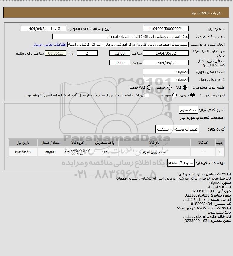| 1 | -- | ست تزریق سرم | عدد | تجهیزات پزشکی و سلامت | 50,000 | 1404/05/02 |