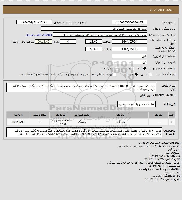 شرح کلی نیاز: خرید کولر آبی سلولزی 18000 (طبق شرایط پیوست) مدارک پیوست باید مهر و امضا و بارگذاری گردد. بارگذاری پیش فاکتور الزامی میباشد.