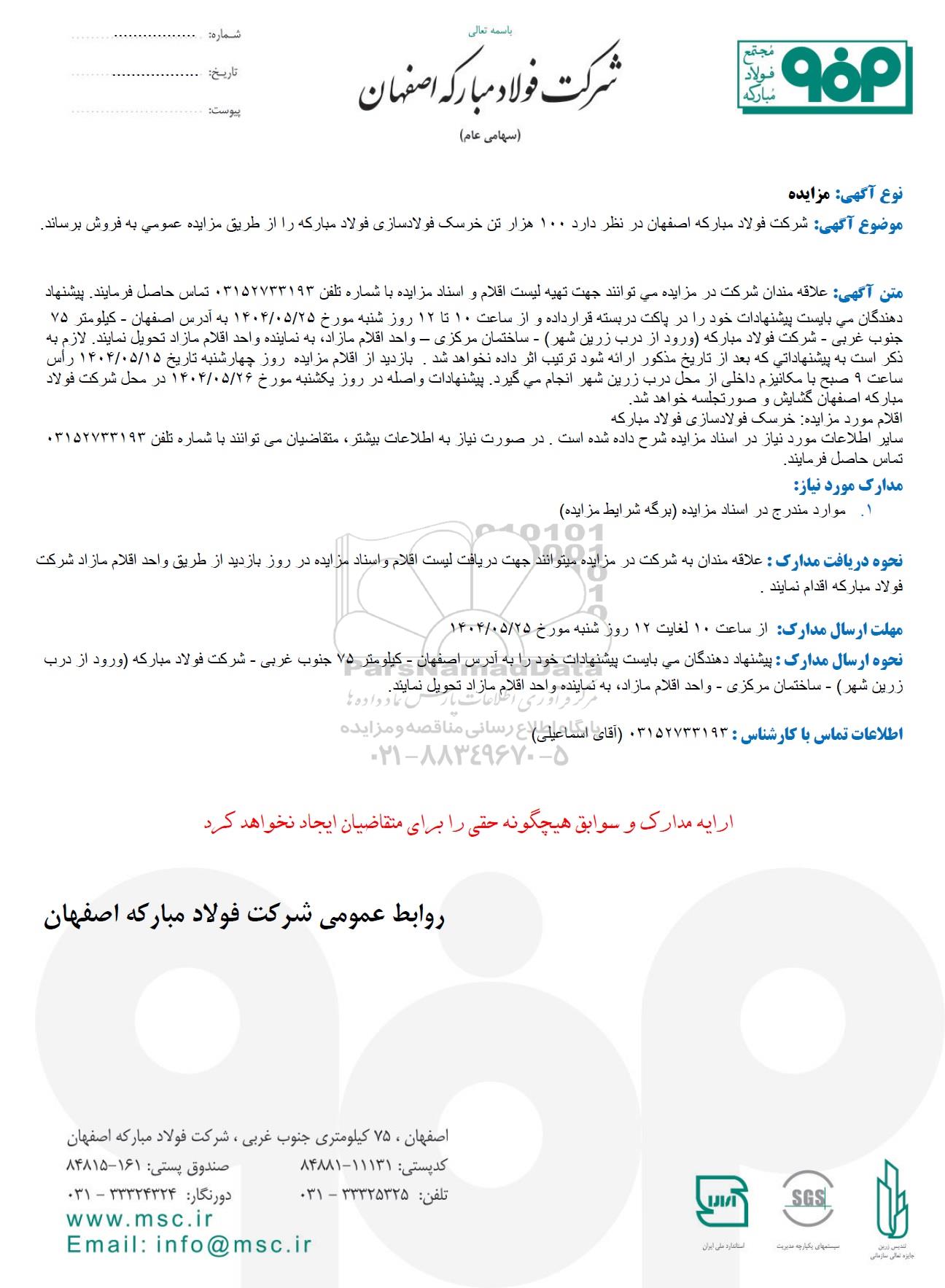 متن آگهی: علاقه مندان شرکت در مزایده می توانند جهت تهیه لیست اقلام و اسناد مزایده با شماره تلفن 03152733193 تماس حاصل فرمایند. پیشنهاد دهندگان می بایست پیشنهادات خود را در پاکت در بسته قرار داده و از ساعت 10 تا 12 روز شنبه مورخ 1404.05.25 به آدرس اصفهان - کیلومتر 75 جنوب غربی - شرکت فولاد مبارکه (ورود از درب زرین شهر) - ساختمان مرکزی - واحد اقلام مازاد، به نماینده واحد اقلام مازاد تحویل نمایند. لازم به ذکر است به پیشنهاداتی که بعد از تاریخ مذکور ارائه شود ترتیب اثر داده نخواهد شد. - بازدید از اقلام مزایده روز چهارشنبه تاریخ 1404.05.15 راس ساعت 9 صبح با مکانیزم داخلی از محل درب زرین شهر انجام می گیرد . پیشنهادات واصله در روز یکشنبه مورخ 1404.05.26 در محل شرکت فولاد مبارکه گشایش و صورتجلسه خواهد شد.