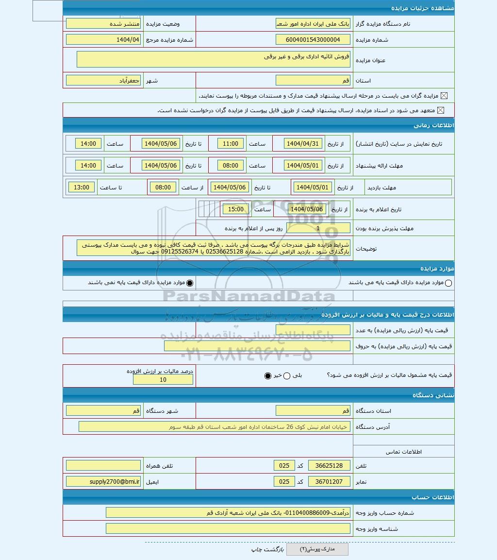 نام دستگاه مزایده گزاربانک ملی ایران اداره امور شعب استان قموضعیت مزایدهمنتشر شده