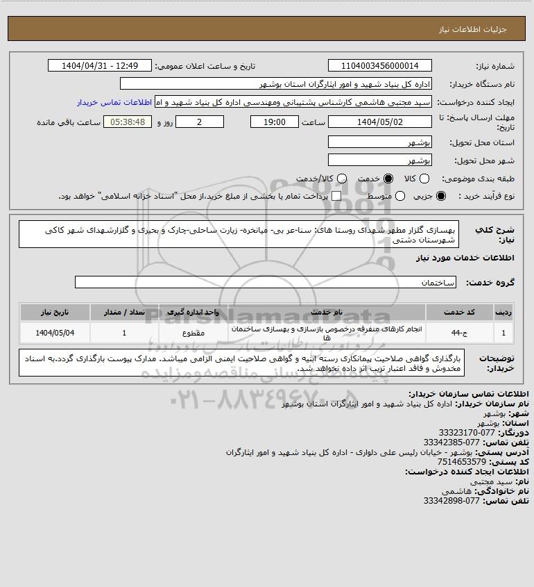 شرح کلی نیاز: بهسازی گلزار مطهر شهدای روستا های: سنا-عر بی- میانخره- زیارت ساحلی-چارک و بحیری و گلزارشهدای شهر کاکی شهرستان دشتی