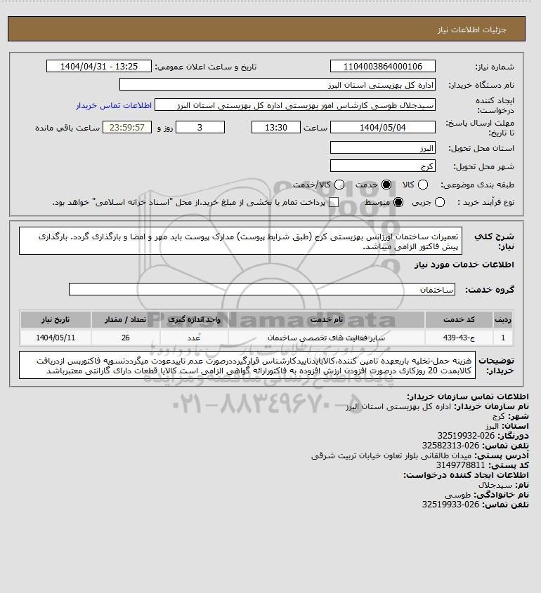 شرح کلی نیاز: تعمیرات ساختمان اورژانس بهزیستی کرج (طبق شرایط پیوست) مدارک پیوست باید مهر و امضا و بارگذاری گردد. بارگذاری پیش فاکتور الزامی میباشد.