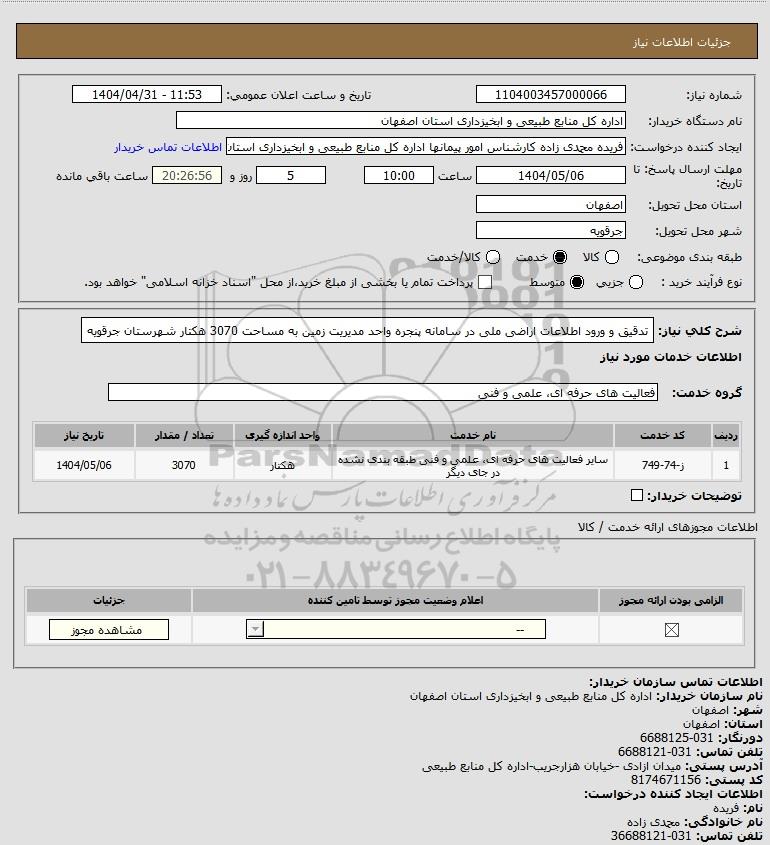 شرح کلی نیاز: تدقیق و ورود اطلاعات اراضی ملی در سامانه پنجره واحد مدیریت زمین به مساحت 3070 هکتار شهرستان جرقویه