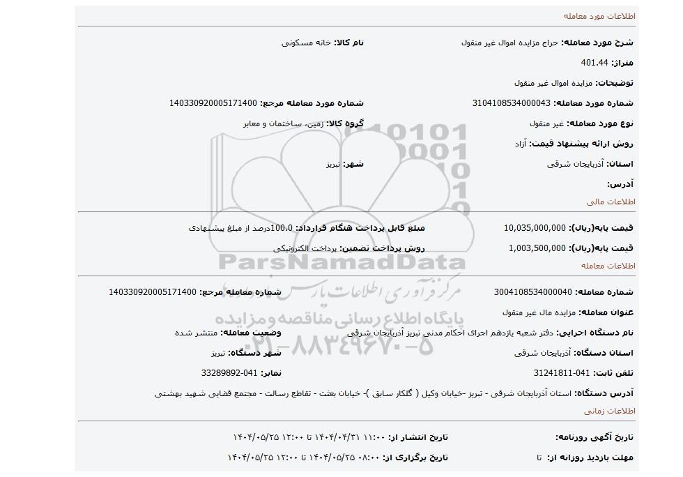 | عنوان معامله: مزایده مال غیر منقول | ||