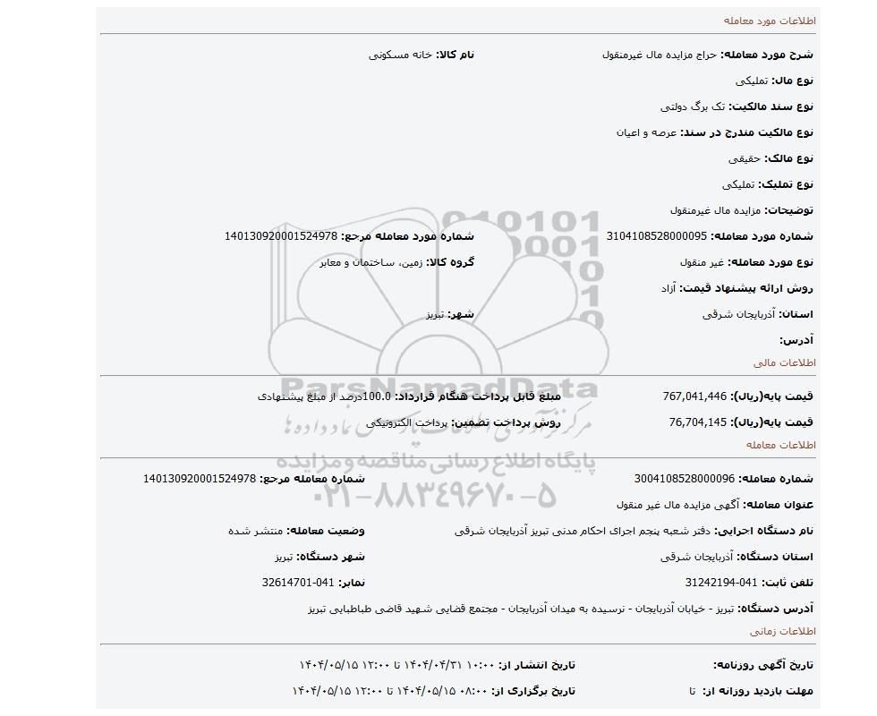 | شماره مورد معامله: 3104108528000095 | شماره مورد معامله مرجع: 140130920001524978 | |