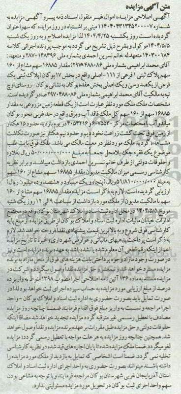 مزایده فروش 16.885 سهم مشاع از 160 سهم یک قطعه زمین مزوعی با پلاک ثبتی 1 فرعی از 111 اصلی