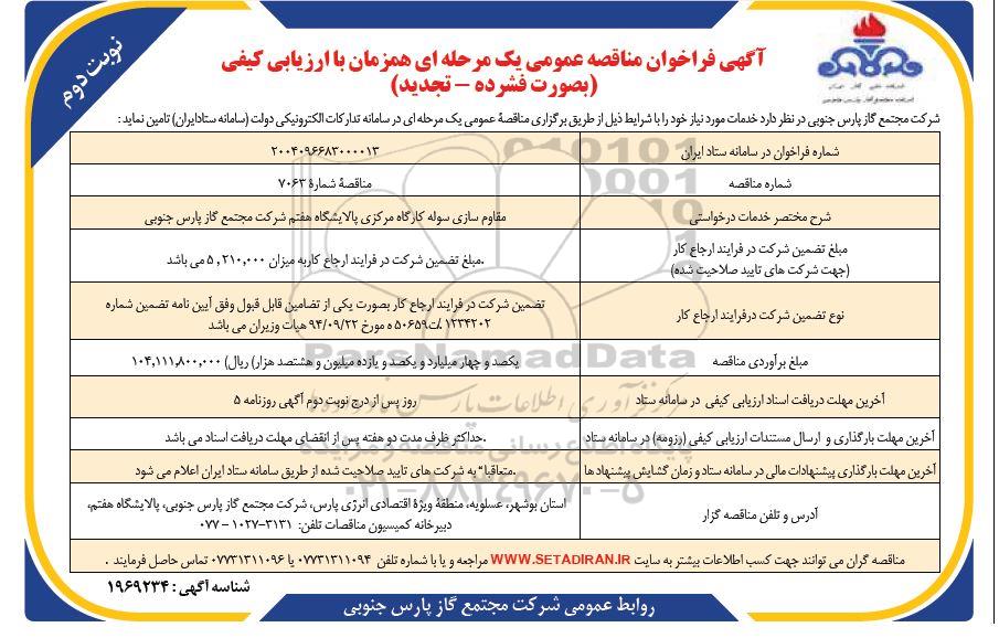 شرکت مجتمع گاز پارس جنوبی در نظر دارد خدمات مورد نیاز خود را با شرایط ذیل به صورت برگزاری مناقصه عمومی یک مرحله ای از طریق سامانه تدارکات الکترونیکی دولت (سامانه ستاد) تامین نماید: