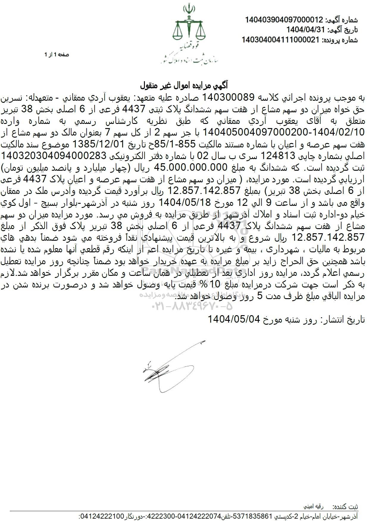 مزایده فروش ملک با پلاک ثبتی 4437 فرعی از 6 اصلی