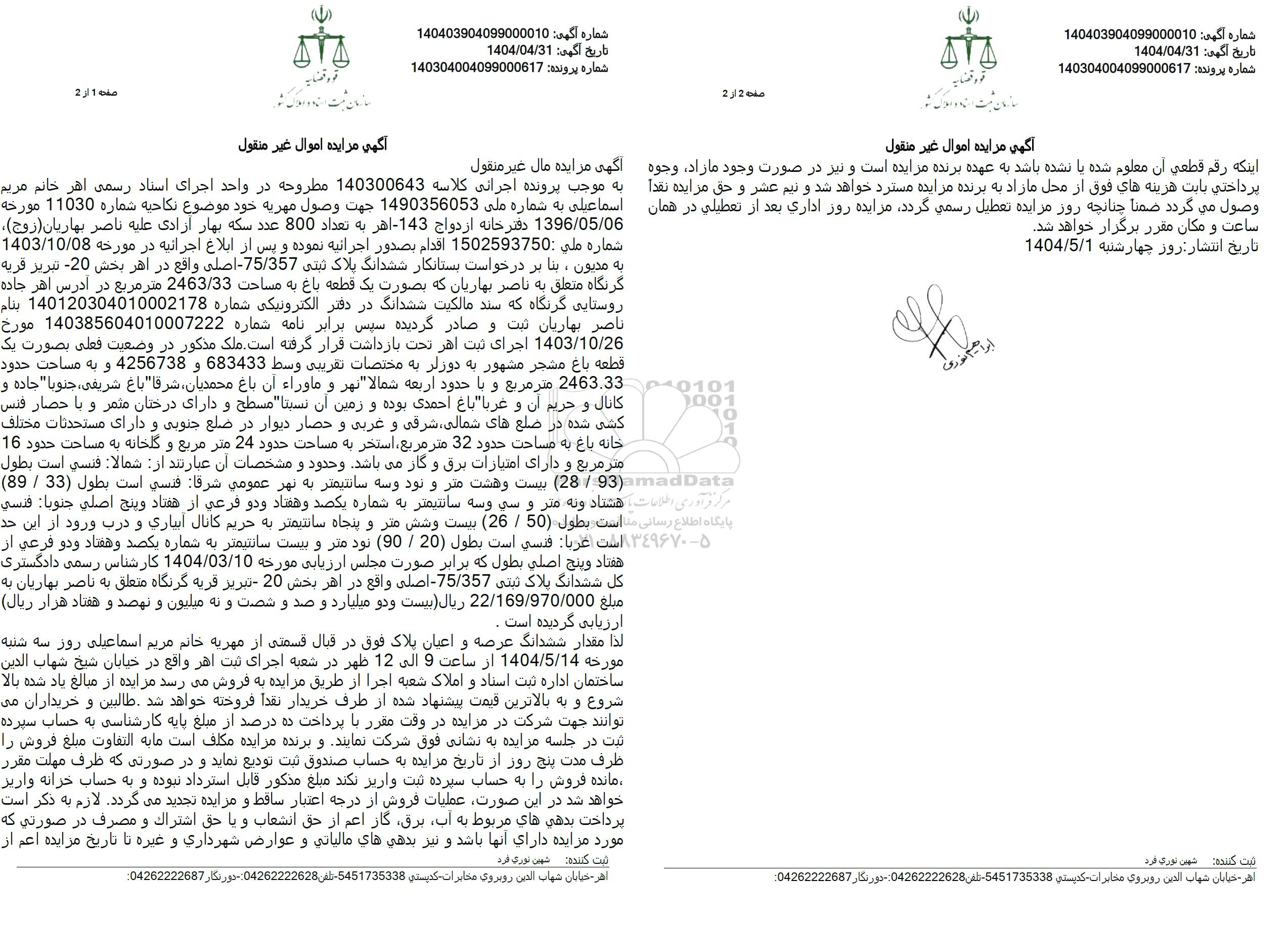 مزایده فروش یک قطعه باغ به مساحت 2463.33 مترمربع با پلاک ثبتی 357 فرعی از 75 اصلی