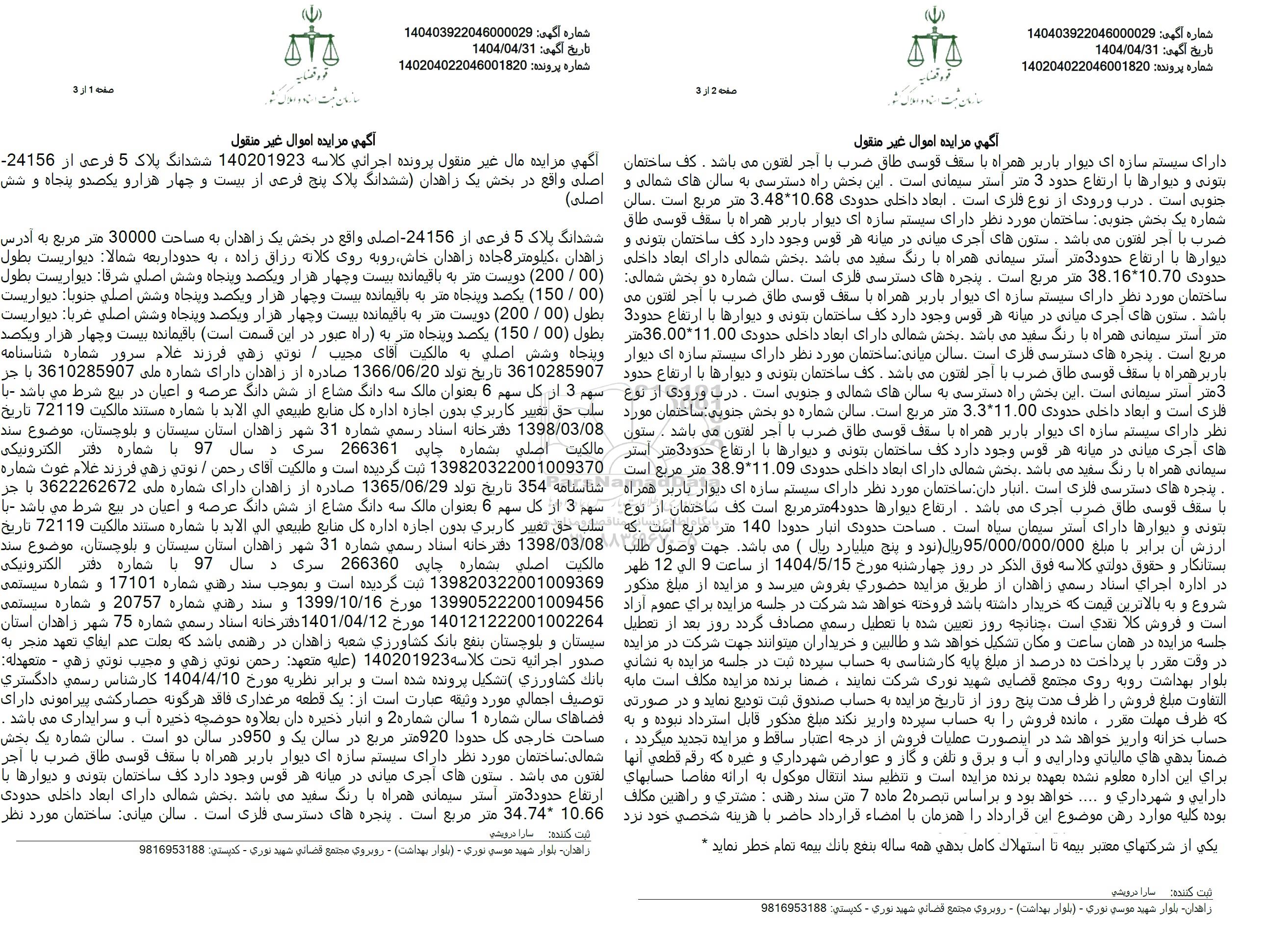 مزایده فروش ششدانگ ملک با مساحت 30000 مترمربع با پلاک ثبتی 5 فرعی از 24156 اصلی