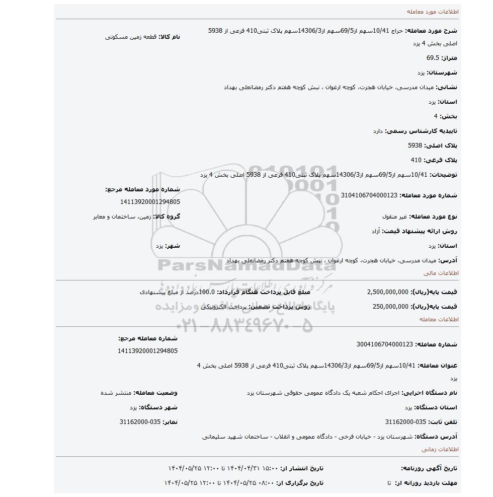 | شرح مورد معامله: حراج 10/41سهم از69/5سهم از14306/3سهم پلاک ثبتی410 فرعی از 5938 اصلی بخش 4 یزد | نام کالا: قطعه زمین مسکونی | |