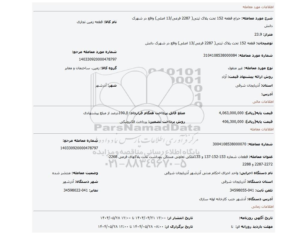 مزایده عمومی مزایده قطعه 152 تحت پلاک ثبتی( 2287 فرعی/13 اصلی) واقع در شهرک دانش برگزار میگردد. از کلیه افراد متخصص و شرکتهای واجد شرایط دعوت به عمل میآید تا در این مزایده با کد خبرگزاری پارس نماد : 9309692 شرکت نمایند تاریخ شروع مزایده : 1404/04/31 مهلت شرکت در مزایده: تا پایان روز 1404/05/28 مکان برگزاری اموال واگذاری استانهای آذربایجان شرقی و دستهبندیهای مربوط به این حراجی املاک و زمین میباشد.