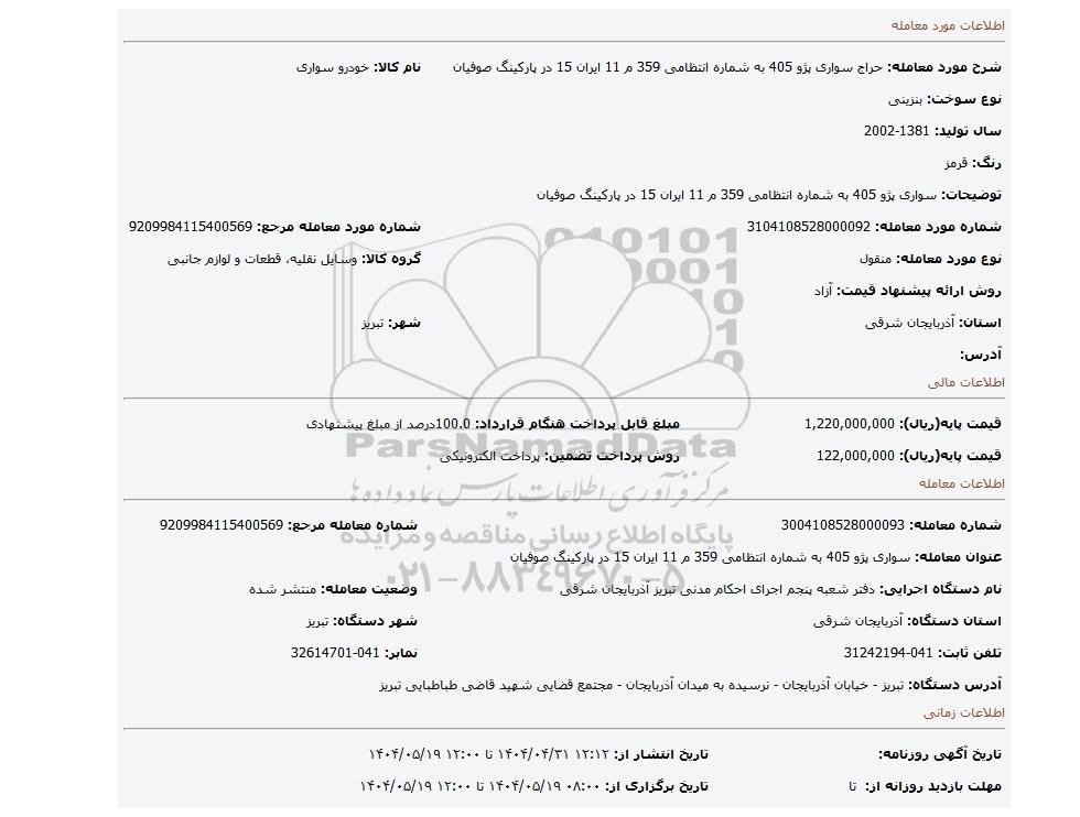 | عنوان معامله: سواری پژو 405 به شماره انتظامی 359 م 11 ایران 15 در پارکینگ صوفیان | ||