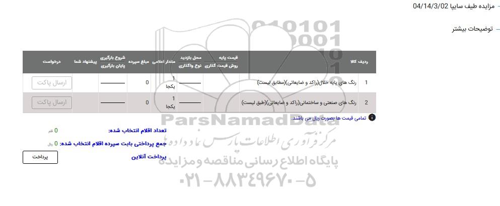 مزایده عمومی مزایده رنگ های پایه حلال (راکد و ضایعاتی) برگزار میگردد. از کلیه افراد متخصص و شرکتهای واجد شرایط دعوت به عمل میآید تا در این مزایده با کد خبرگزاری پارس نماد : 9309776 شرکت نمایند تاریخ شروع مزایده : 1404/04/30 مهلت شرکت در مزایده: تا پایان روز 1404/05/01 مکان برگزاری اموال واگذاری استانهای تهران و دستهبندیهای مربوط به این حراجی چسب ، رنگ و رزین میباشد.
