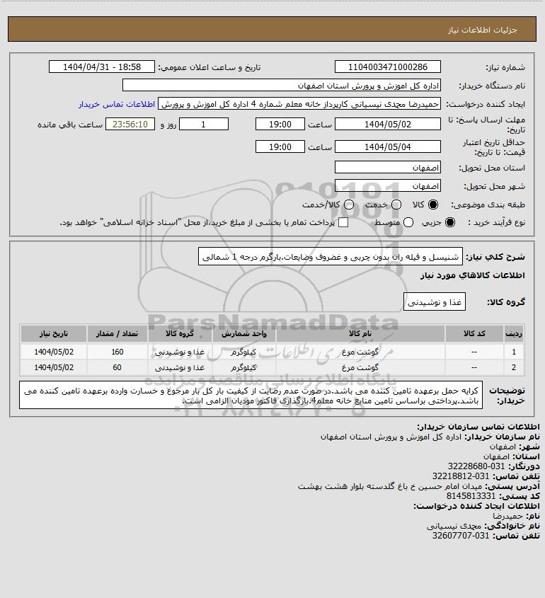 شرح کلی نیاز: شنیسل و فیله ران بدون چربی و غضروف وضایعات.بارگرم درجه 1 شمالی