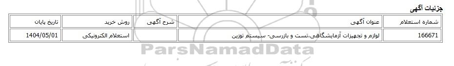 | 166671 | لوازم و تجهیزات آزمایشگاهی،تست و بازرسی- سیستم توزین | استعلام الکترونیکی | 1404/05/01 |