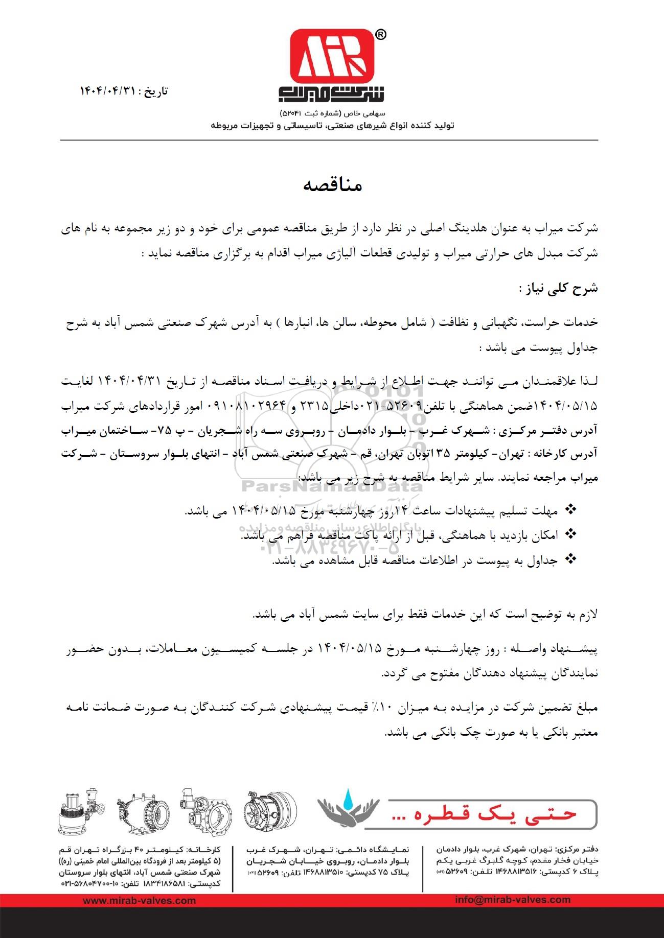 شرکت میراب به عنوان هلدینگ اصلی در نظر دارد از طریق مناقصه عمومی برای خود و دو زیر مجموعه به نام های شرکت مبدل های حرارتی میراب و تولیدی قطعات آلیاژی میراب اقدام به برگزاری مناقصه نماید: