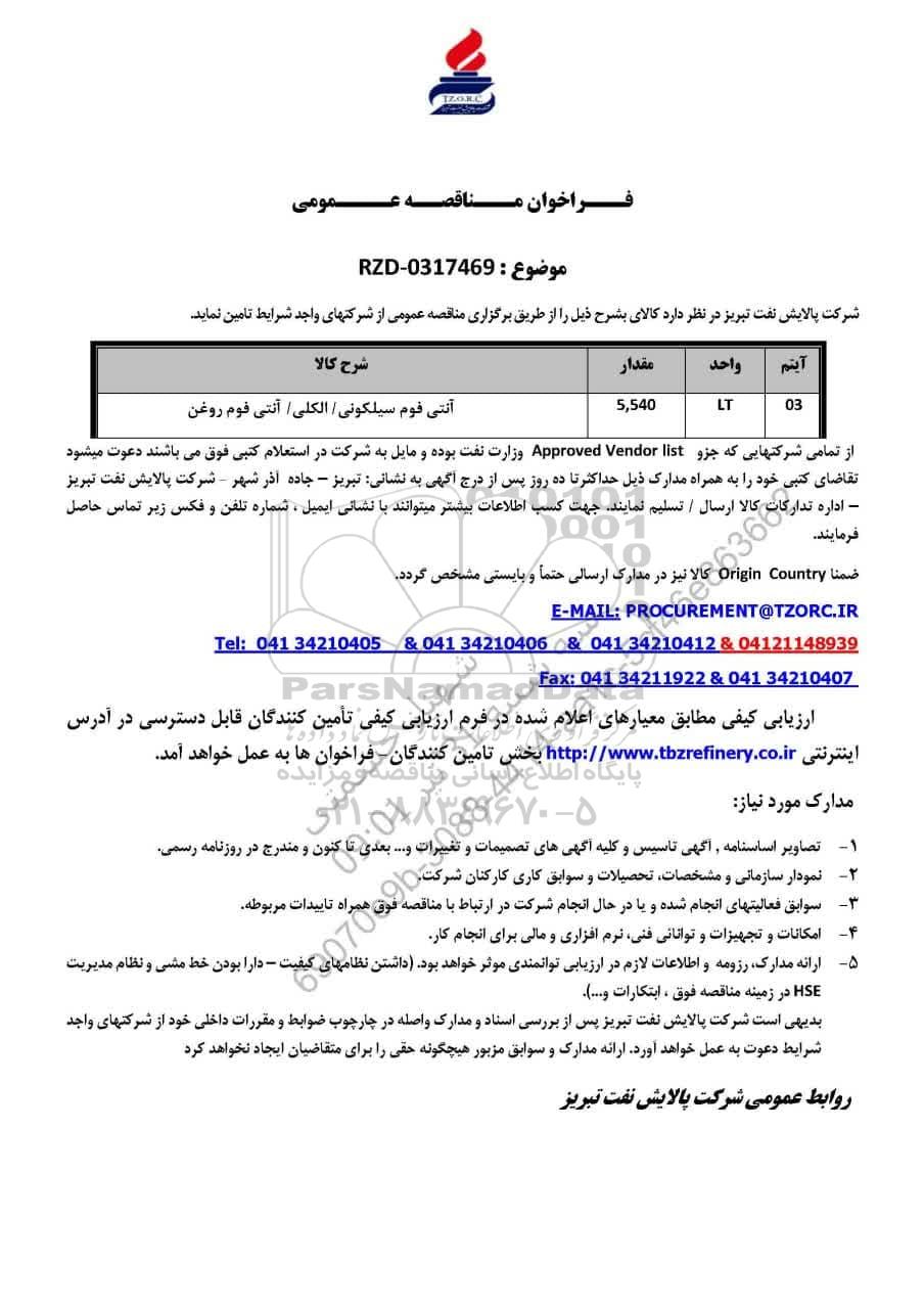 شرکت پالایش نفت تبریز در نظر دارد کالای بشرح ذیل را از طریق برگزاری مناقصه عمومی از شرکتهای واجد شرایط تامین نماید.