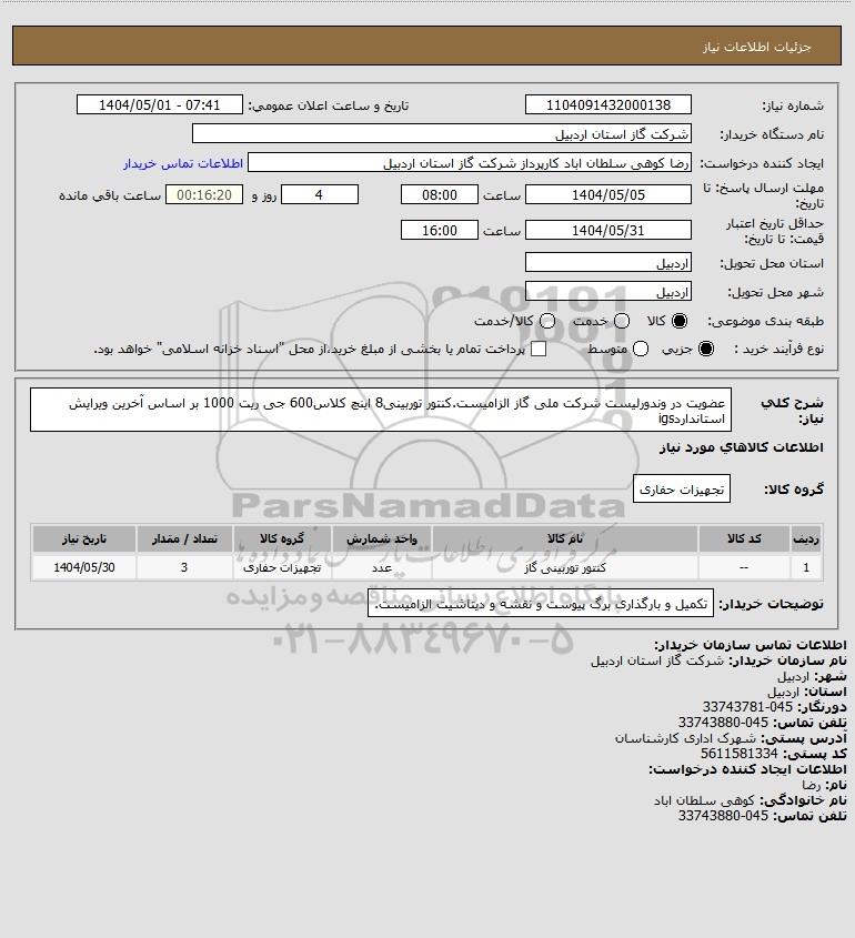 1 -- کنتور توربینی گاز عدد تجهیزات حفاری 3 1404/05/30