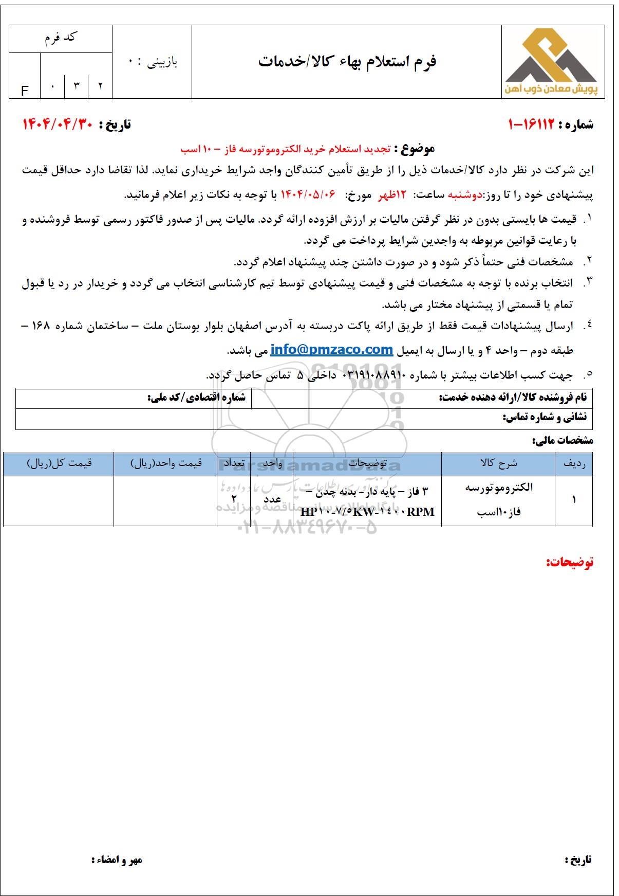 موضوع: تجدید استعلام خرید الکتروموتور سه فاز - 10 اسب