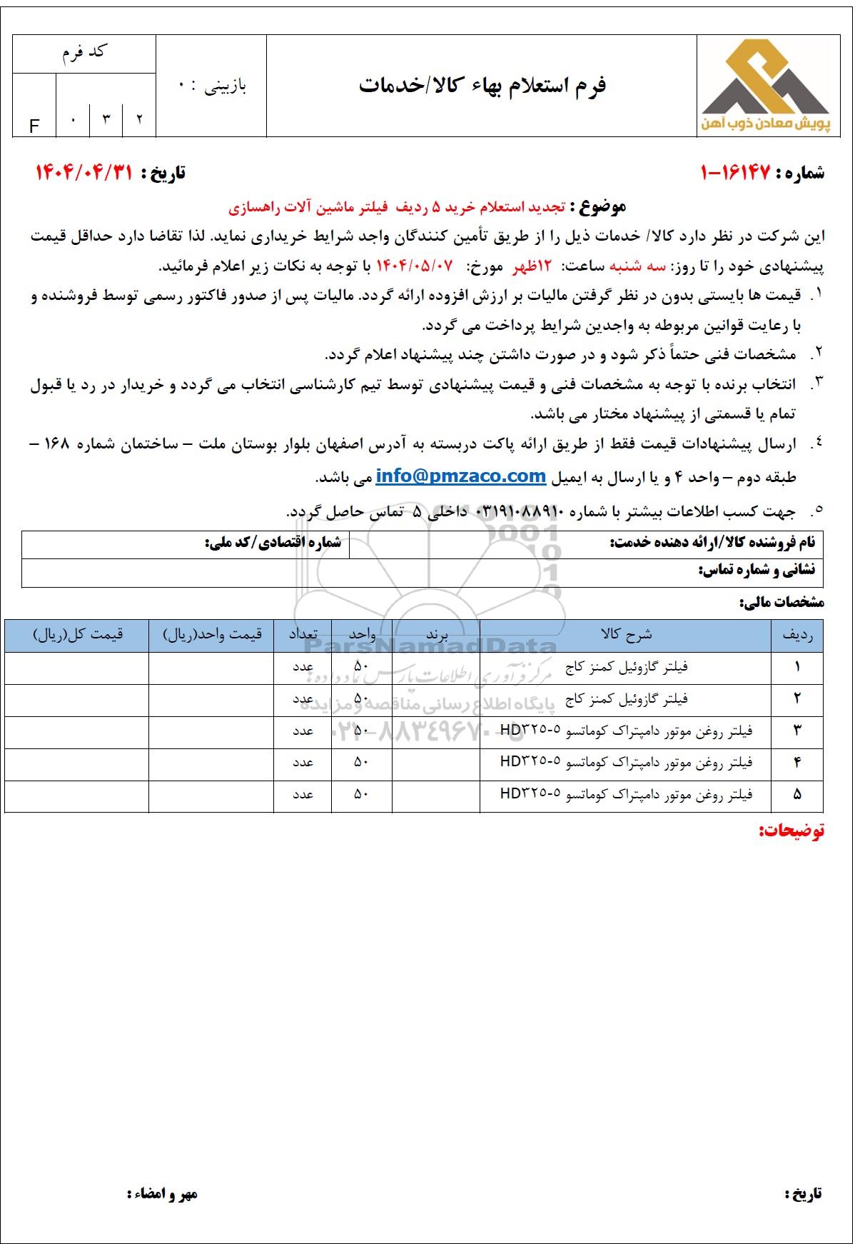 موضوع: تجدید استعلام خرید 5 ردیف فیلتر ماشین آلات راهسازی