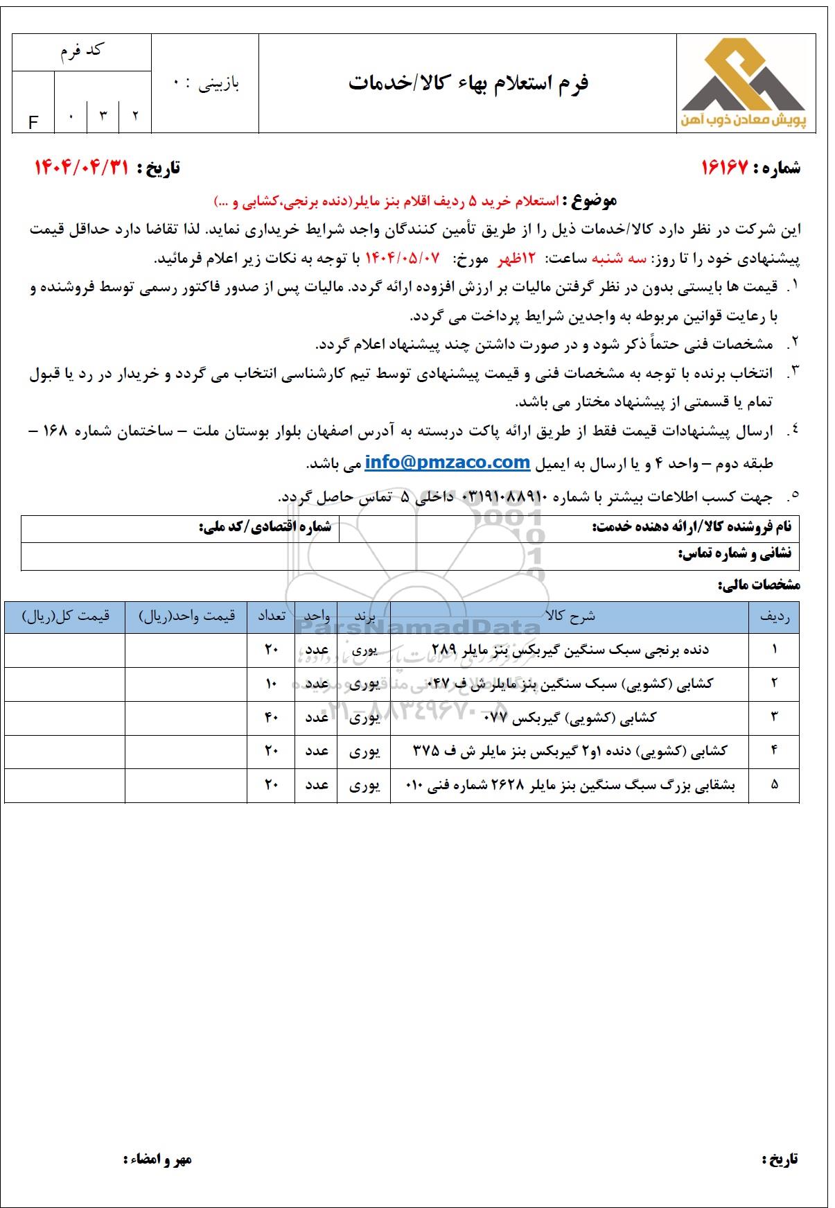 موضوع: استعلام خرید 5 ردیف اقلام بنز مایلر (دنده برنجی، کشابی و...)