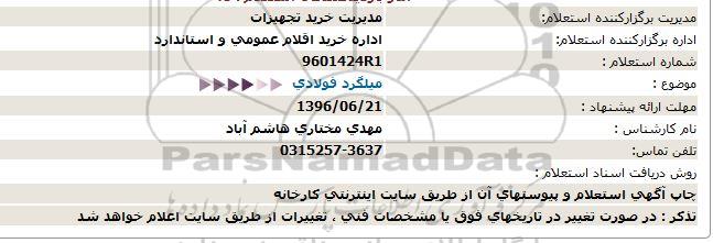 استعلام بها و موضوع استعلام استعلام, استعلام میلگرد فولادی به اطلاع کلیه شرکتها و افراد متخصص واجد شرایط میرساند، آگهی گذار در نظر دارد از طریق استعلام بها، نسبت به انتخاب و دریافت پیشنهادات اقدام نماید. این استعلام با کد آگهی ثبت شده در سامانه خبرگزاری پارس نماد : 931095 منتشر شده است. مشخصات استعلام : تاریخ شروع استعلام: 1396/06/19 آخرین مهلت ارسال پیشنهاد قیمت : 1396/06/21 و محل اجرای پروژه : استان اصفهان میباشد. استعلام قیمت مورد درخواست : استعلام, استعلام میلگرد فولادی با دستهبندیهای تخصصی و گروه های مرتبط : آهن آلات, استعلام اطلاع رسانی میگردد.