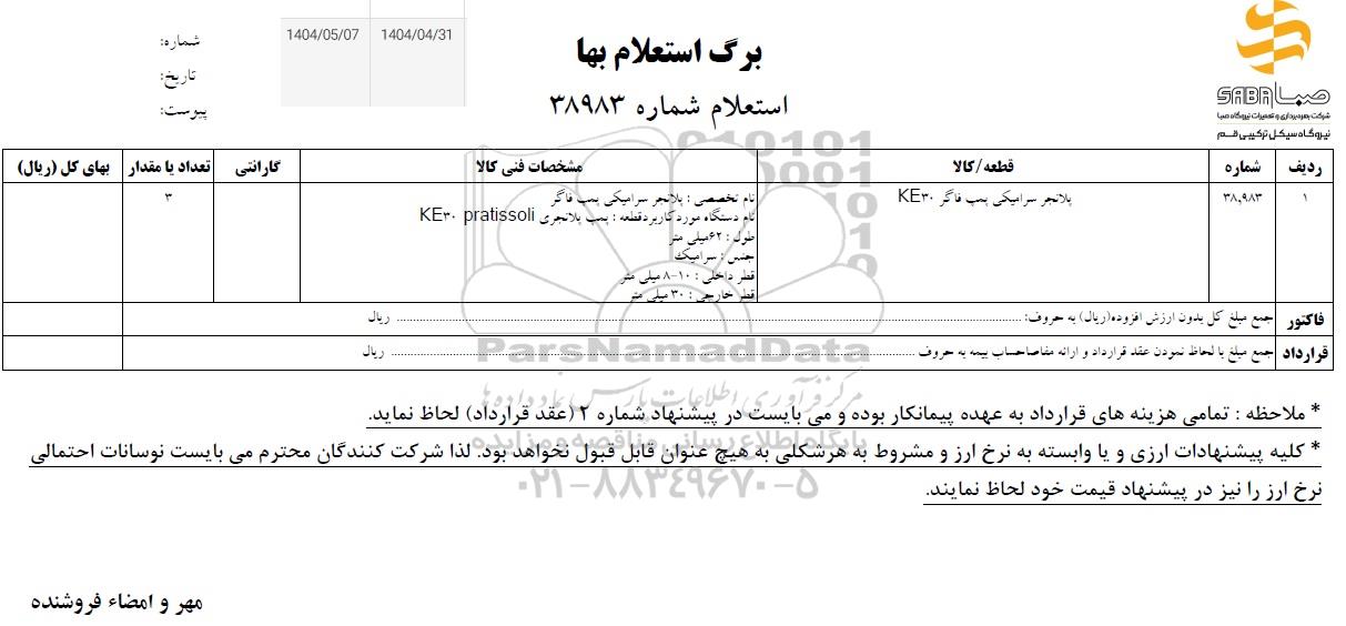 استعلام بها و موضوع استعلام استعلام پلانجر سرامیکی پمپ فاگر KE30 به اطلاع کلیه شرکتها و افراد متخصص واجد شرایط میرساند، آگهی گذار در نظر دارد از طریق استعلام بها، نسبت به انتخاب و دریافت پیشنهادات اقدام نماید. این استعلام با کد آگهی ثبت شده در سامانه خبرگزاری پارس نماد : 9311284 منتشر شده است. مشخصات استعلام : تاریخ شروع استعلام: 1404/04/31 آخرین مهلت ارسال پیشنهاد قیمت : 1404/05/07 و محل اجرای پروژه : استان قم میباشد. استعلام قیمت مورد درخواست : استعلام پلانجر سرامیکی پمپ فاگر KE30 با دستهبندیهای تخصصی و گروه های مرتبط : الکتروموتور و پمپ های شناور, انواع مواد و قطعات نسوز, نیروگاه, تجهیزات برق و الکترونیک, استعلام اطلاع رسانی میگردد. شرایط شرکت در استعلام آنلاین : ابتدا ثبت نام در سامانه استعلام پارس نماد و تکمیل مدارک موردنیاز و بارگذاری در سامانه رعایت تمامی ضوابط و الزامات مندرج در اسناد استعلام است.