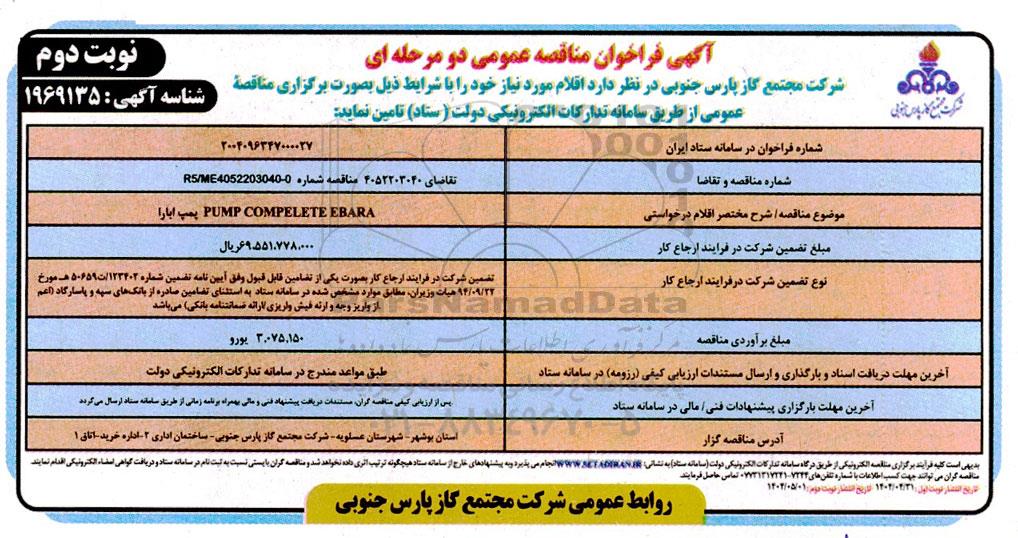 مناقصه پمپ ابارا PUMP COMPELETE EBARA- نوبت دوم از کلیه افراد متخصص و شرکتها واجد شرایط دعوت به عمل میآید در مناقصه با کد خبرگزاری پارس نماد: 9311810 شرکت نمایند.