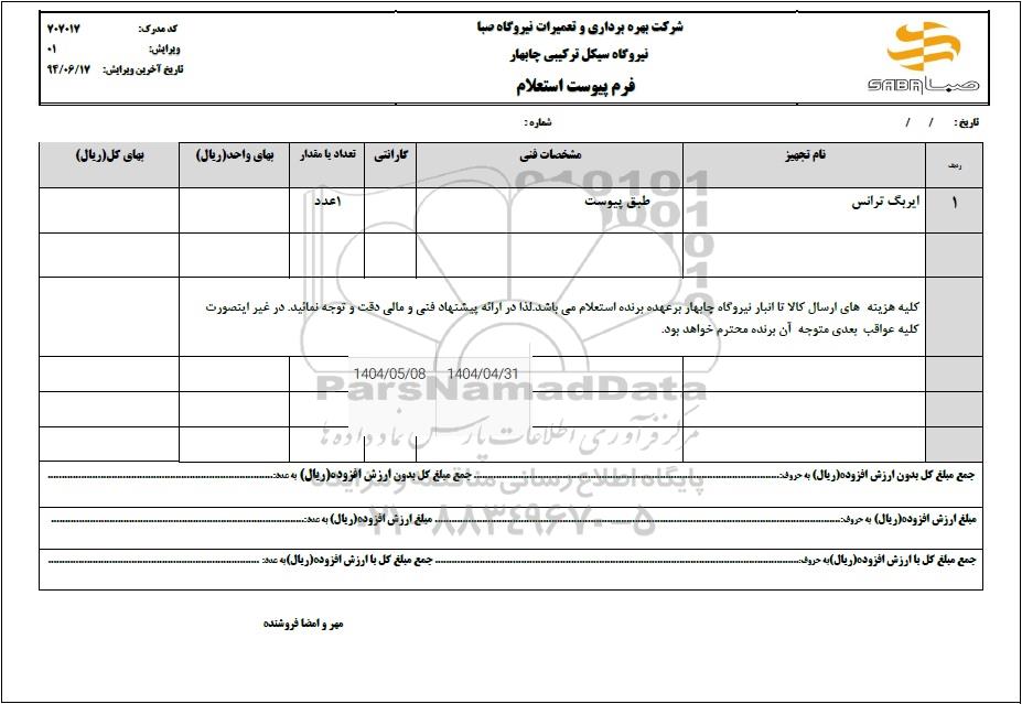 نحوه دریافت اسناد و ارسال پیشنهاد: متقاضیان میتوانند با ثبت نام در سامانه مناقصات و مزایدات ایران (پارس نماد) نسبت به مشاهده اسناد استعلام، دریافت اطلاعات تکمیلی، و ثبت پیشنهاد قیمت خود اقدام نمایند. در صورت نیاز به دریافت راهنمایی یا پشتیبانی در خصوص استعلام و مناقصه و فراخوان مناقصه عمومی، مناقصه محدود، مناقصه بین المللی، مناقصه دولتی، مناقصه خصوصی، مناقصه آنلاین فروش تجهیزات، مناقصه مشاورهای مناقصه پتروشیمی و انرژی مناقصه صنایع و تجهیزات برق و مخابرات و نفت و گاز ... لطفاً با سایت خبری مناقصه و مزایده پارسنماد دادهها به شماره 88349670 تماس حاصل فرمایید.