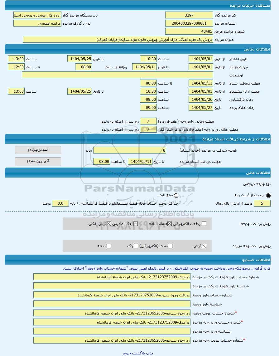 عنوان مزایدهفروش یک فقره املاک مازاد آموزش وپروش قانون مولد سازی(خیابان گمرک) -مزایده ساختمان - استان کرمانشاه