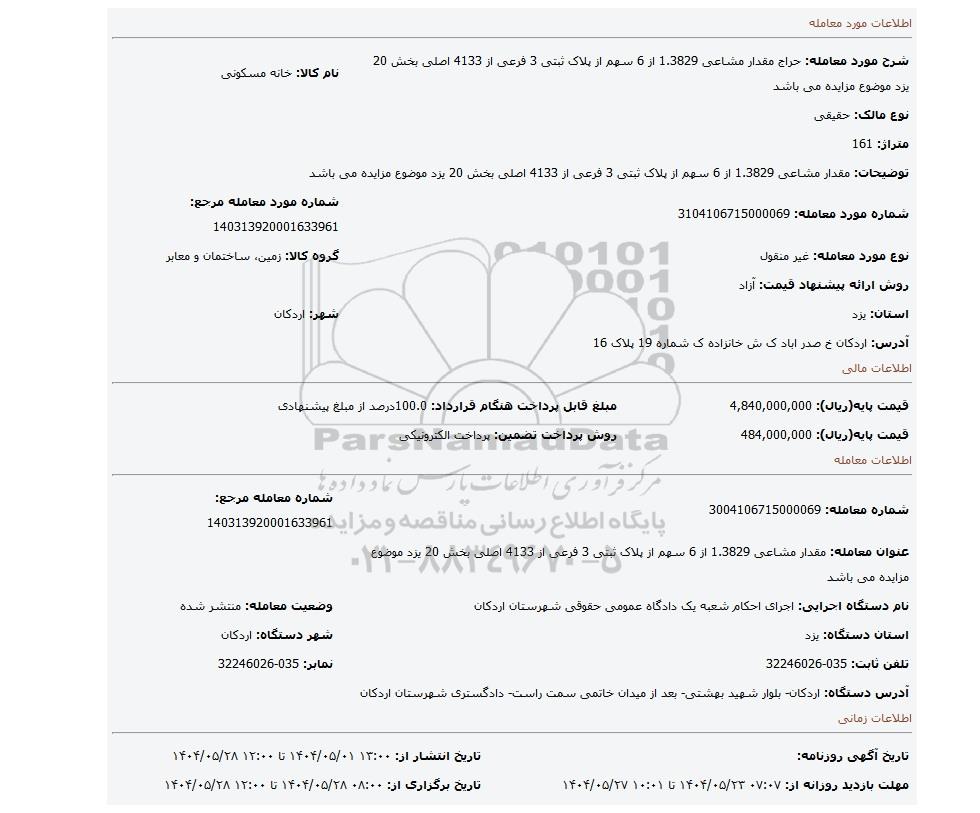 عنوان معامله: مقدار مشاعی 1.3829 از 6 سهم از پلاک ثبتی 3 فرعی از 4133 اصلی بخش 20 یزد موضوع مزایده می باشد