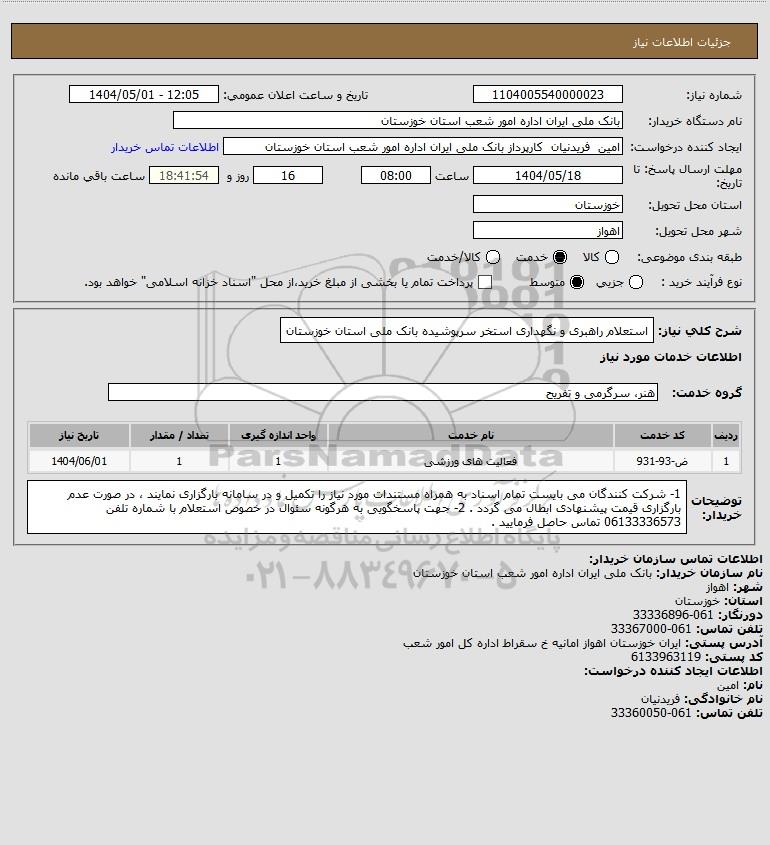 شرح کلی نیاز: استعلام راهبری و نگهداری استخر سرپوشیده بانک ملی استان خوزستان