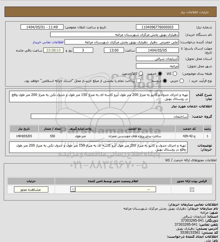 شرح کلی نیاز: تهیه و اجرای جدول و کانیو به متراژ 200 متر طول آبرو کاسه ای به متراژ 150 متر طول و جدول تکی به متراژ 200 متر طول واقع در روستای بهنق