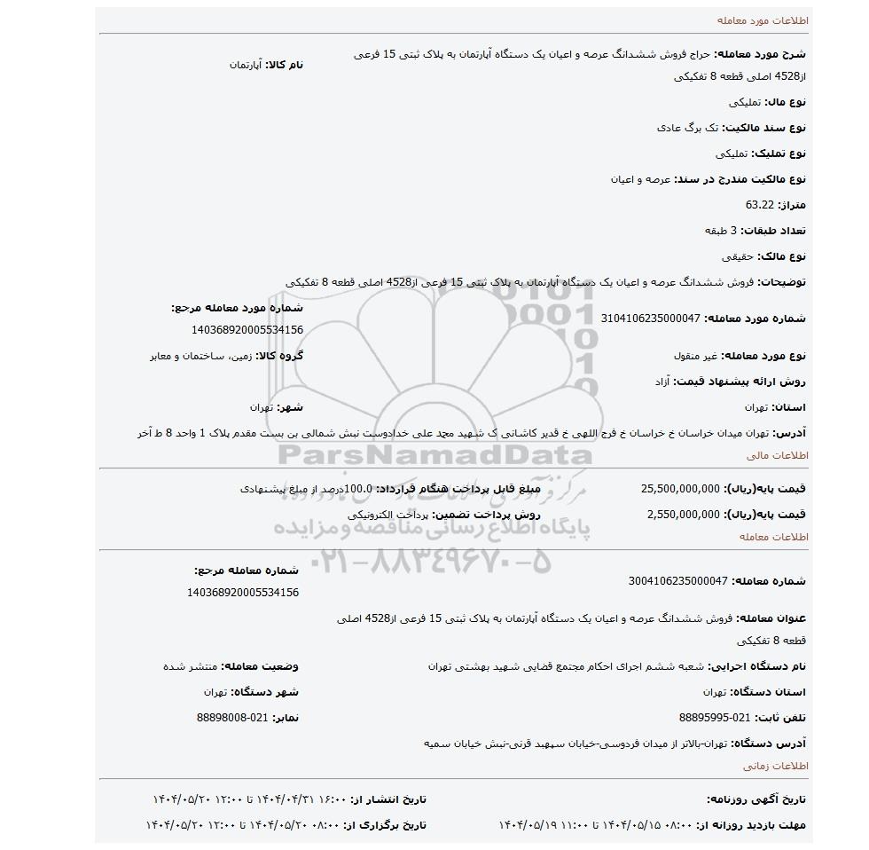 شرح مورد معامله: حراج فروش ششدانگ عرصه و اعیان یک دستگاه آپارتمان به پلاک ثبتی 15 فرعی از4528 اصلی قطعه 8 تفکیکینام کالا: آپارتمان