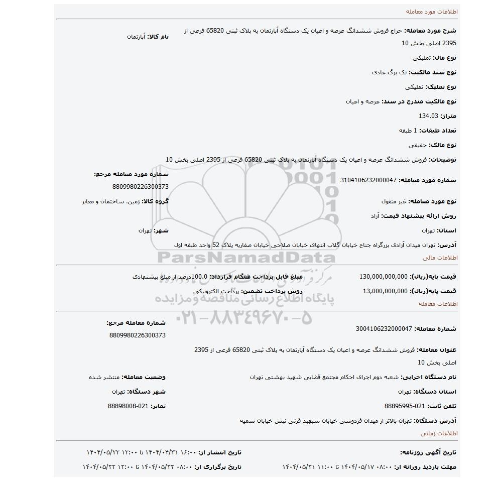 | شرح مورد معامله: حراج فروش ششدانگ عرصه و اعیان یک دستگاه آپارتمان به پلاک ثبتی 65820 فرعی از 2395 اصلی بخش 10 | نام کالا: آپارتمان | |