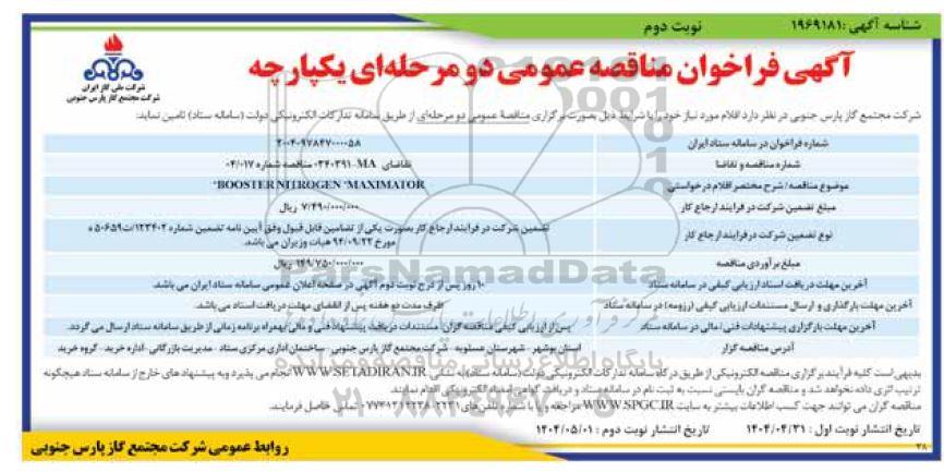 مناقصه عمومی BOOSTER NITROGEN "MAXIMATOR"- نوبت دوم از کلیه افراد متخصص و شرکتها واجد شرایط دعوت به عمل میآید در مناقصه با کد خبرگزاری پارس نماد: 9313837 شرکت نمایند.