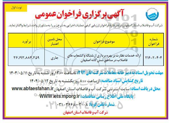 | 216-2-404 | ارائه خدمات نظارت بر بهره برداری از شبکه و انشعاب های فاضلاب در مناطق ششگانه اصفهان | جاری | 36.193.884.359 |