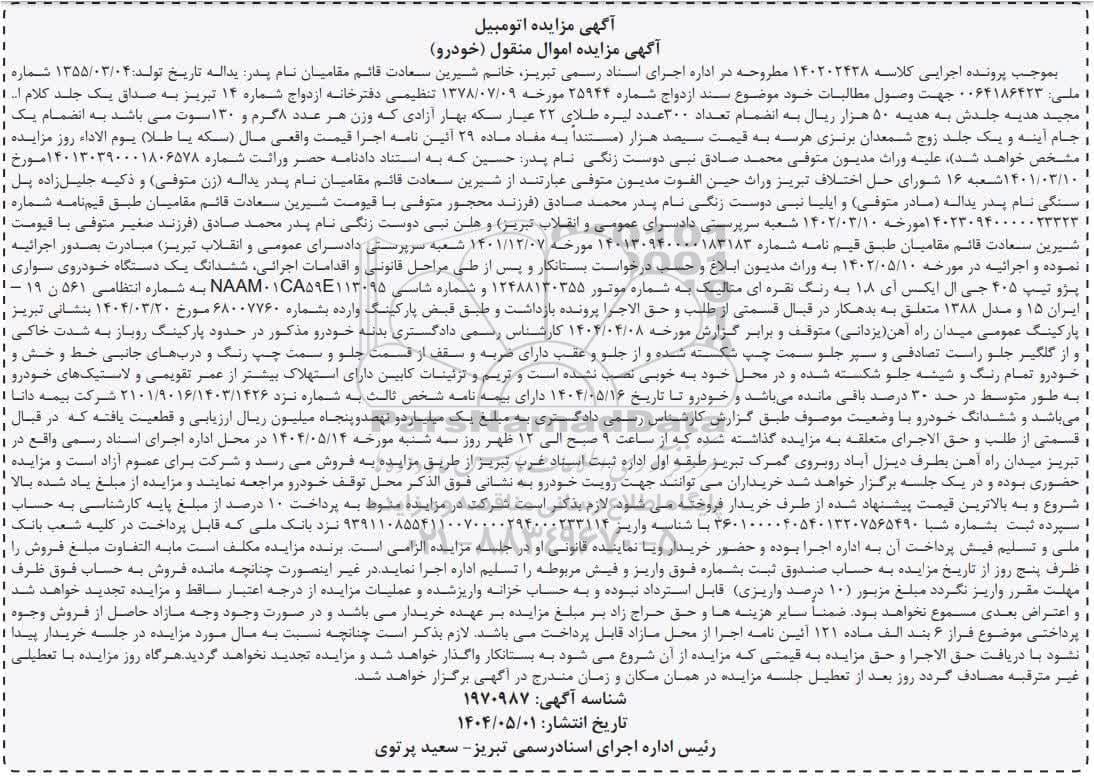 مزایده فروش یکدستگاه خودروی سواری پژو تیپ 405 جی ال ایکس آی مدل 1388 به مبلغ یک میلیارد و نهصد و پنجاه میلیون ریال